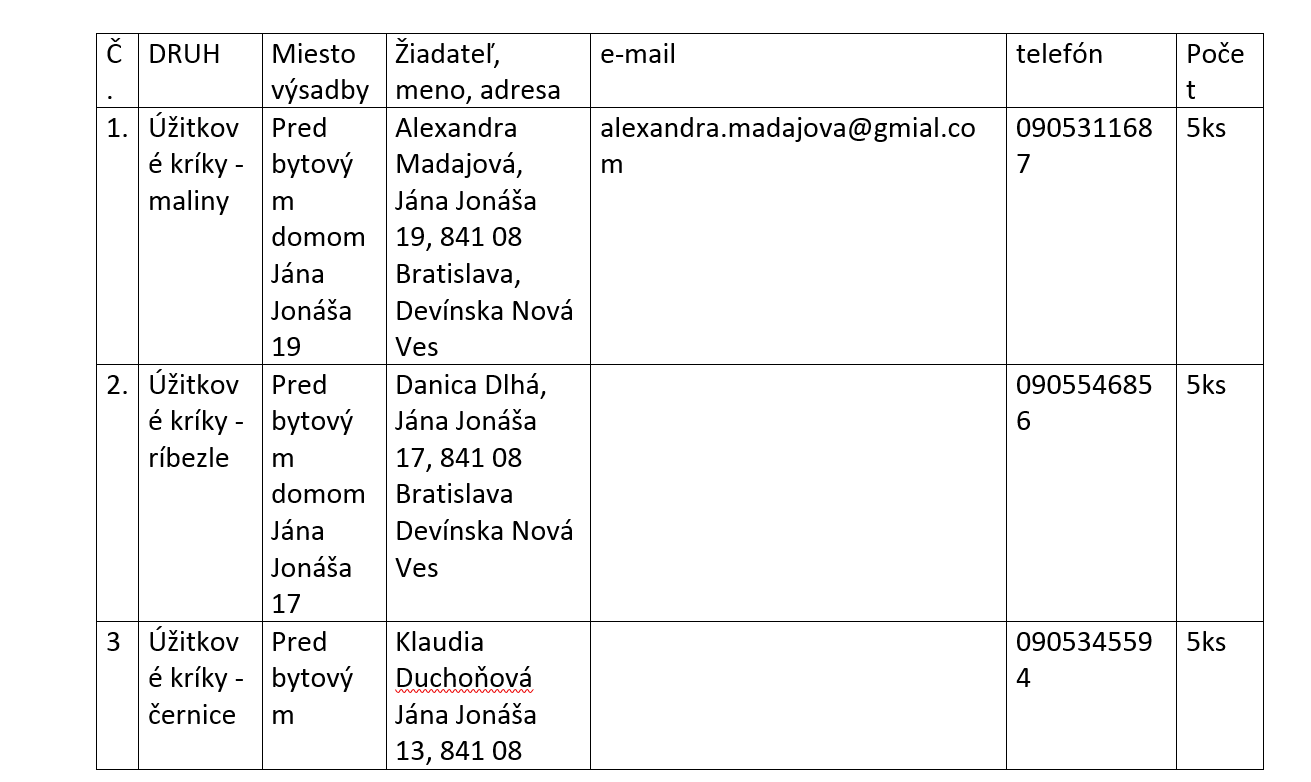 Miestny úrad každý rok na jar a jeseň prideľuje na základe žiadostí okrasné kríky. Na informáciu, či môžu byť namiesto okrasných aj úžitkové, bolo oznámené aby sme skúsili podať žiadosť. Tak skúšame :-)